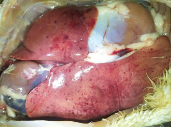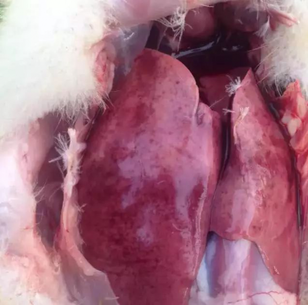鴨肝炎病毒潛伏期一般為1~4d,突然發病,病程短促。病初表現為精神萎靡,眼半閉呈昏睡狀,羽毛松亂,翅下垂,行動呆滯,縮頸呆立,食欲不振甚至厭食、絕食;發病12~24h即出現神經癥狀,病鴨全身性抽搐、運動失調、兩腳痙攣,身體倒向一側或就地旋轉,頭向后仰呈角弓反張狀,故俗稱“背脖病”。少數病鴨死亡前排黃白色和綠色稀糞,數小時后死亡。也有的雛鴨無明顯臨床癥狀便突然死亡。 剖析可見肝臟特征性病變:肝臟腫大,質地柔軟,呈淡紅色或花斑狀,表面有出血點和出血斑,膽囊擴張,充滿膽汁。脾臟有時腫大,也呈斑駁狀。腎臟充血、腫脹,呈暗紫色樹枝狀。